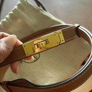Elevate your style with this stunning Epsom leather belt in color gold with the iconic Hermes Kelly buckle. I love this belt but don’t have enough items in my wardrobe to pair with it. In excellent condition with no damage. Plastic removed from hardware.