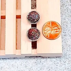 These are handmade earrings made of stainless steel with a peacock druzy agate stone. The earrings are round stud style with a silicone bullet back closure. The main stone is 12mm in width and is round in shape. The earrings are nickel-free and the metal purity is stainless steel. The earrings are perfect for occasions such as Mother's Day, Christmas, Birthday, and Valentine's Day. The earring length is also 12mm.