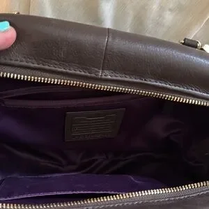 This Coach shoulder bag in rich brown leather exudes sophistication with its structured silhouette and smooth finish. The metallic turn-lock closure and silver-tone hardware add a touch of elegance, making it a versatile accessory for any occasion.