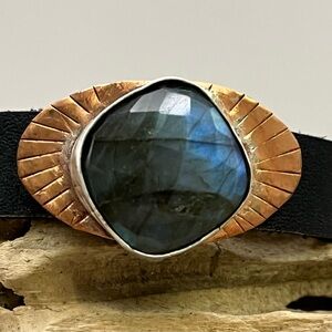 This elegant leather bracelet features a striking black band with a copper accent and a blue labradorite gemstone perfect for adding a touch of sophistication to any outfit.