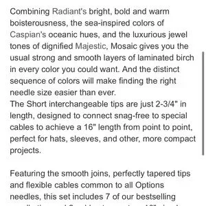 NEW Knitpicks Short Interchangeable Mosaic Multicolored Wood Knitting Needles Set. See photos for specific and detailed information. Set includes sizes 4-10. From climate controlled and scent free environment. Please message with any questions. Or for additional photographs. Thank you.