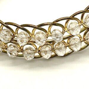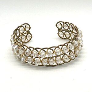 This vintage cuff bracelet combines a gold-tone wire design with clear faceted beads, offering a timeless and elegant accessory for various styles.