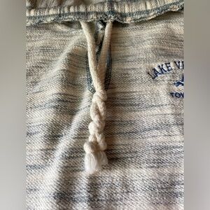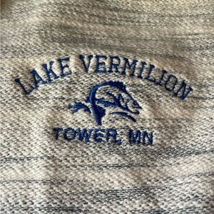 Cozy striped hoodie with Lake Vermilion logo. Features a front pocket and drawstring hood.