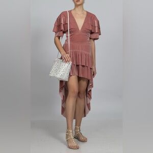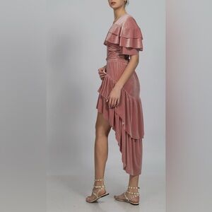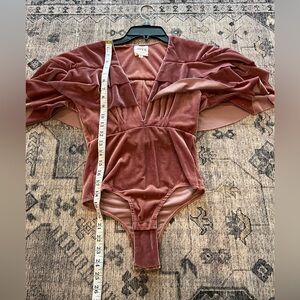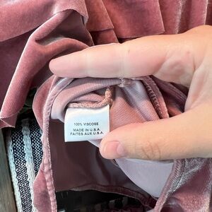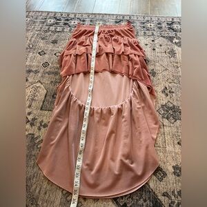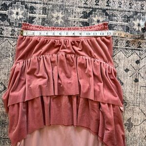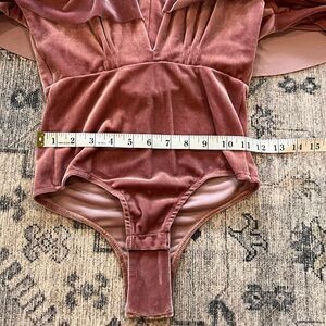 EUC Miss Los Angeles women’s 2 piece velvet set size XS. This set is absolutely stunning! A mauve/dark pink color, the top is a bodysuit with ruffle sleeves and the skirt is a high low skirt! I’ve included all the measurements so please check the photos for them in inches!