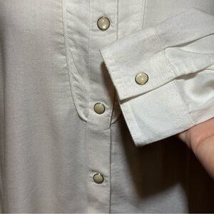 Ariat Chimayo Trujillo women’s snap button, long sleeve shirt size Medium. This classic snap-down shirt is detailed with Chimayo weaving-inspired embroidery designed by the artists at Centinela Traditional Arts. 55% Cotton and 45% Viscose blended twill. Tuck it in and shine under the arena lights. Pop the collar, tie it up, and wear it out on the town. Pre-loved great condition.