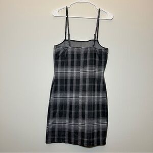 This chic mini dress features a sleek slip style with a sleeveless design and delicate spaghetti straps. The black and gray color palette adds a touch of elegance, making it perfect for a casual night out. Its fitted silhouette and classic plaid pattern offer a timeless appeal.