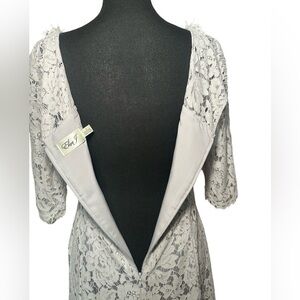 Very good pre owned condition! Soft grey lace overlay with quarter length sleeves. Lined, zipper and small keyhole back.