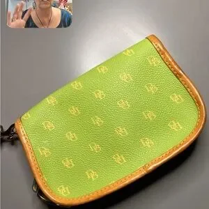 Stylish lime green wristlet with tan accents. Features a secure snap closure and wrist strap. With the DB Logo in Tan.