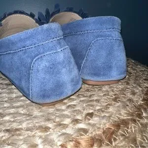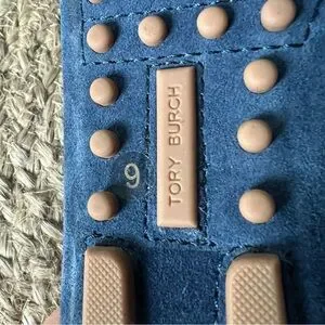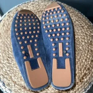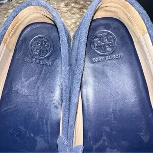 Tory Burch Navy Sea Blue Suede Driving Shoes. Fringe at Vamp, Polished Gold Tone Logo and Grosgrain Ribbon Accents. Padded Insole, Cutout Rubber Sole.