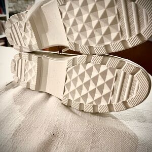 Stylish high-top sneakers by Sincerely Jules. Features a tan canvas upper with white rubber soles and laces.