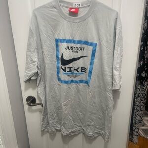 Embrace a classic look with this Nike gray short sleeve tee, featuring a retro-inspired graphic design. The iconic Nike swoosh is framed within a light blue border, adding a touch of nostalgia to your casual wardrobe. Crafted from soft cotton, this crew neck shirt offers comfort and style for everyday wear.