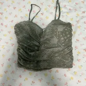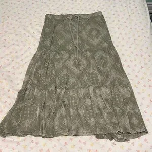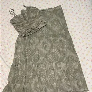 Size XS for the skirt and Size S for the top. This summery green printed skirt is perfect for any occasion this summer. Its stylish design offers a comfortable fit and a chic look.