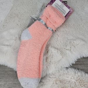 This bundle includes TART Intimates pajama bottoms. Size is Medium. Color is gray. Elastic waistband. Also, in this bundle are 2 pairs of lavender & Shea butter infused non-skid slipper socks from Minx NY. All items are new with tags.