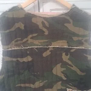 Unique camouflage vest with patchwork design. Features multiple patterns and textures.