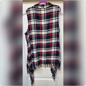 Plaid sleeveless vest with fringe detail. Features red, navy, & white colors. Asymmetrical hem.
