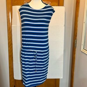 Stylish mini dress with blue and white stripes. Features a drawstring waist for a flattering fit. Perfect for casual outings. Cinched waist with tie, zippers on both shoulders