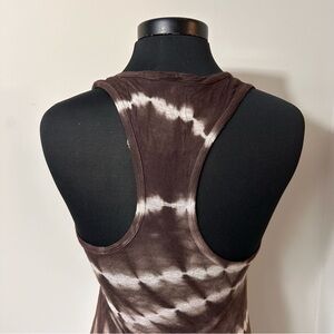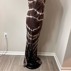 Young Fabulous & Broke Brown Tie-Dye Midi Dress in Size Medium. Slit on side, stretch material, ruched on one side. Material: 100% Rayon. Approximate measurements: Length: 60”, Bust: 15”