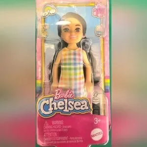 Barbie Chelsea Doll BNIB Dark Hair Brown Eyes Pastel Plaid Dress