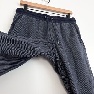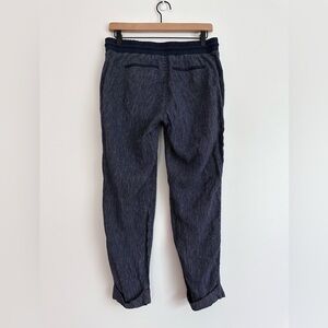 100% Linen Bali Pants from Athleta. Navy blue and white stripes. Front and back pockets. Functional drawstring. Tapered leg. Cuffed hem.