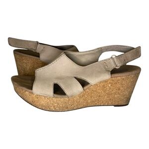 Clarks Collection Beige Soft Cushion Cork Wedge Open Toe Sandal Women's Size 8