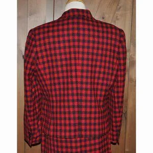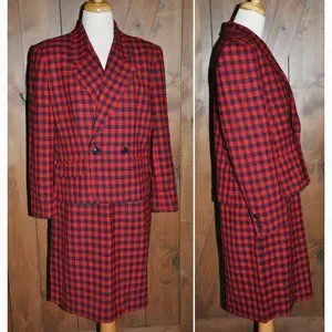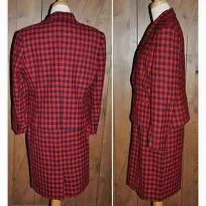 This is a gorgeous vintage Liz Claiborne red & navy blue plaid wool straight skirt & long sleeve jacket ensemble and it is amazing. The jacket is double breasted and has a slit in the back for freedom of movement. The straight skirt has a zipper in the back and a long kick pleat with a black lining on both pieces. This suit can be worn to work or to a formal affair so it is very versatile.