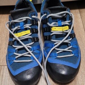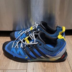 Explore the outdoors with Adidas men's shoes, featuring a striking blue and yellow design. Perfect for adventure seekers. shoes for have some scuffs. please see all photos.