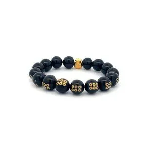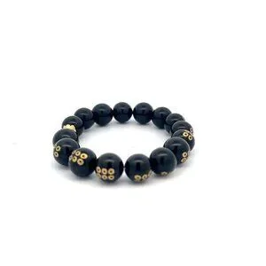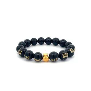 24K Yellow Gold Money Bag Lucky Bracelet Carved Black Agate Gemstones 10mm