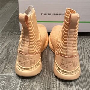 Stylish APL sneakers with a unique high-top design. Features a textured peach upper. Perfect for casual wear.