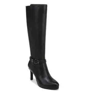 These sleek black heeled boots by Naturalizer feature a high heel that adds elegance to any outfit. The knee-high design is complemented by a slightly textured leather-like material and a rounded toe for a classic look.