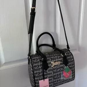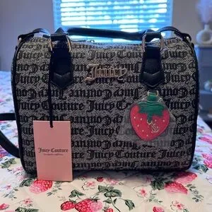 This Juicy Couture satchel showcases a sophisticated black and gray monogram print, complemented by black leather accents and handles. Its structured, boxy shape is enhanced by a playful strawberry charm, adding a touch of whimsy to its elegant design.