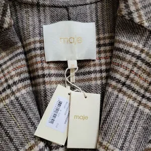 Maje Garion Wool Blazer. Plaid design in tan, brown, mustard and hint of orange. Two Button closure and collared. Wool blend. Women's 36, chest measures abou t 19" and length about 29". Their size chart lists a 36 as a US Small. NWT original retail $525.