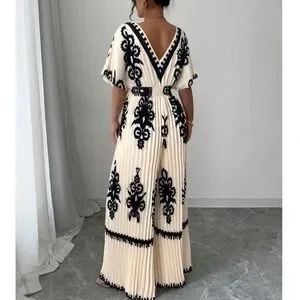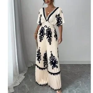 Classic Plunging Neck Kimono Sleeve Pleated Wide Leg Jumpsuit