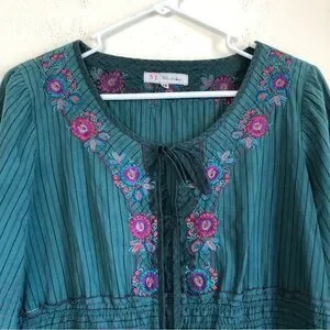 This gorgeous dress is in pristine, like new condition. The embroidery on this dress is incredibly pretty and impeccably detailed as shown. Has never been worn and all stitching is in excellent condition. In a super pretty tealish blue color.