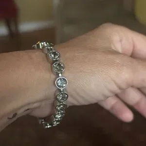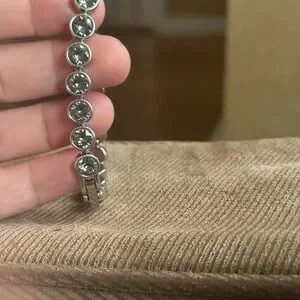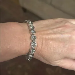 This exquisite Touchstone Crystal bracelet features a classic tennis design, crafted in shimmering silver with a continuous line of sparkling crystals. Each stone is meticulously set in a prong setting, creating a flexible and elegant chain that drapes beautifully on the wrist. Perfect for adding a touch of sophistication to any ensemble.