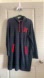 The dress is navy blue with red details, including the drawstrings for the hood, a red-outlined "H" logo patch on the chest, and red accents on the pocket openings.