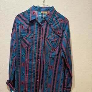 Stylish Wrangler button down shirt. Features vibrant blue and red patterns. Perfect for casual wear.