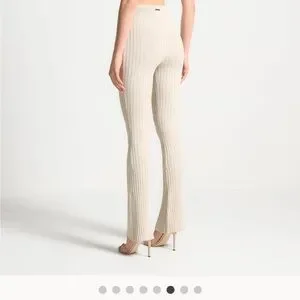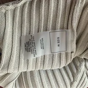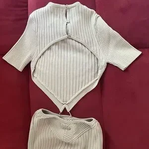 This elegant cream jumpsuit by Maniere De Voir showcases a ribbed knit texture and a sophisticated cut-out design at the waist. Its high-waisted, bodycon silhouette and halter-style top create a chic and versatile look, perfect for any occasion. Fits true to size and has stretch. Jumpsuit has not been worn but tags have been removed.