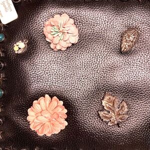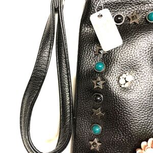 This is a NWT Southern Sparkle black embellished clutch wristlet/crossbody. A cute black purse embellished with flowers, leaves and decorative studs in silver, black, pink, white and blue. The inside is brown & comes with 3 compartments & 2 slip compartments on one side, and a zip pocket on the other side. 11 1/2” x 7 3/4” approx. measurements. Adjustable strap. Cute purse.