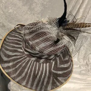 This brown and gray sinamay hat has an animal-like pattern to it. Ivory and black French netting, an ivory and brown flower, Guinea feathers and pheasant tail feathers tie in the wild print feel. Perfect for cocktail parties, galas, garden parties, church, or the Kentucky Derby.