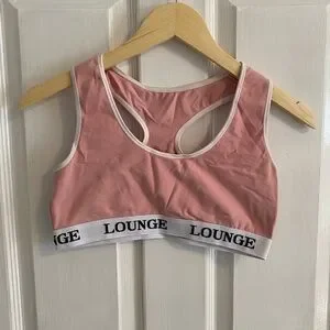 This pink sports bra features a racerback design and wide shoulder straps, providing comfort and support for light activities. Crafted from a soft, stretchy material, it is perfect for everyday wear. The elastic band at the bottom adds a stylish touch with its repeated text design. The set comes with matching leggings as well, with the iconic Lounge waistband