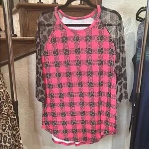 Embrace a relaxed style with the Crazy Train Pink and Black Raglan Tee, featuring a striking graphic design. This top combines a vibrant pink and black color palette with 3/4 length sheer sleeves for a casual yet eye-catching look. Perfect for adding a bold touch to your everyday wardrobe.