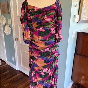 Gorgeous DVF floral mesh dress in Oasis pattern with vibrant pinks, blues, and greens. Features figure flattering ruching and detailing.