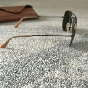 Stylish Ray-Ban aviator sunglasses featuring sleek purple lenses. Comes with a brown case.