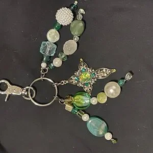 This handmade elegant cross and jewels bag charm/keychain features a silver cross and a stunning array of green and silver beads, perfect for adding a touch of sophistication to your accessories. The intricate design is both stylish and functional.