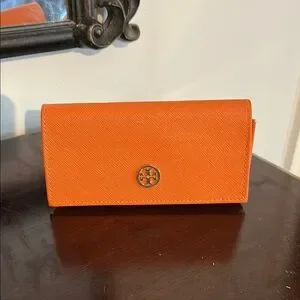 Chic orange sunglasses case featuring the iconic Tory Burch logo.