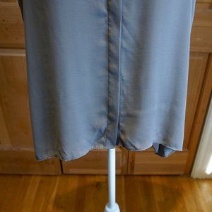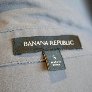 BANANA REPUBLIC Gray Semi-Sheer Pleated Back Oversize Button Down Blouse in Size S! Blouse features hidden front button enclosures, semi-sheer pleated back, cap sleeves, slight hi/low, and collar. Material tag has been removed, so please see measurements below. Item is in good condition, with some slight general wear (i.e. piling, loose threads, etc), please ese photos for reference.