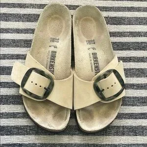 Comfortable Birkenstock sandals in beige. Features large buckles for a secure fit. In size 37, which I believe is 6-6.5. Hardly worn and in excellent condition.
