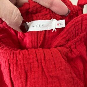NWT brand new! “Chili” red cotton dress with shoulder ties! Cute & Comfy! Wear to beach or on a hot summer day! Elastic neckline, stretches a lot! Soft. It has pockets! Measurements in photos. ( a lot of stretch, could fit Large) LUSH brand, great quality dresses for women. Size medium. Smoke free home