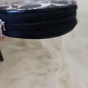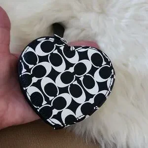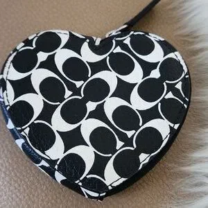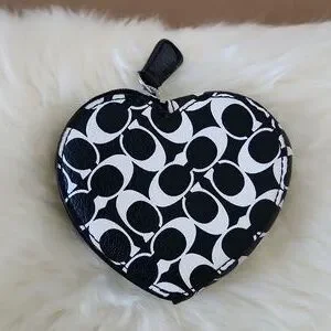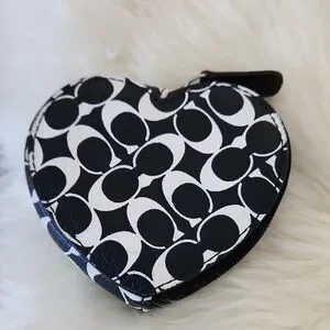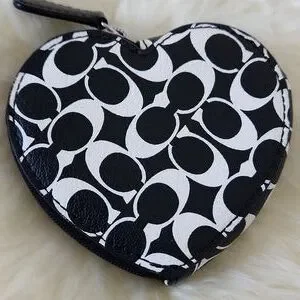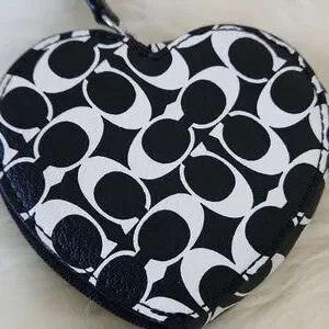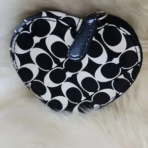 Adorable Coach black and white Signature leather heart coin wallet is in excellent like new condition. Sweet heart-shaped wallet with black leather and white signature design and silver hardware. It measures approximately 3 3/4" across and 3 1/2" from top to bottom. A great on the go wallet for your necessities! From non-smoking home. ๐ค๐ช๐ค๐