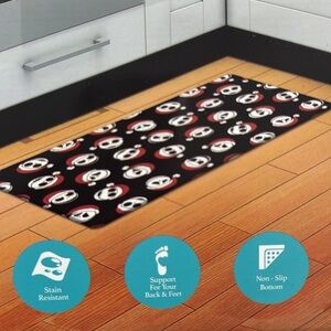 Features a repeating pattern of Jack Skellington's head wearing a Santa hat against a black background. The mat, made of 100% PVC Foam is designed with a non-slip feature suitable for various rooms including the kitchen expecially, porch, foyer, and patio. The style is modern, and the theme incorporates both cartoon and holiday elements. This kitchen mat combines functionality with a festive and recognizable design from the popular movie.